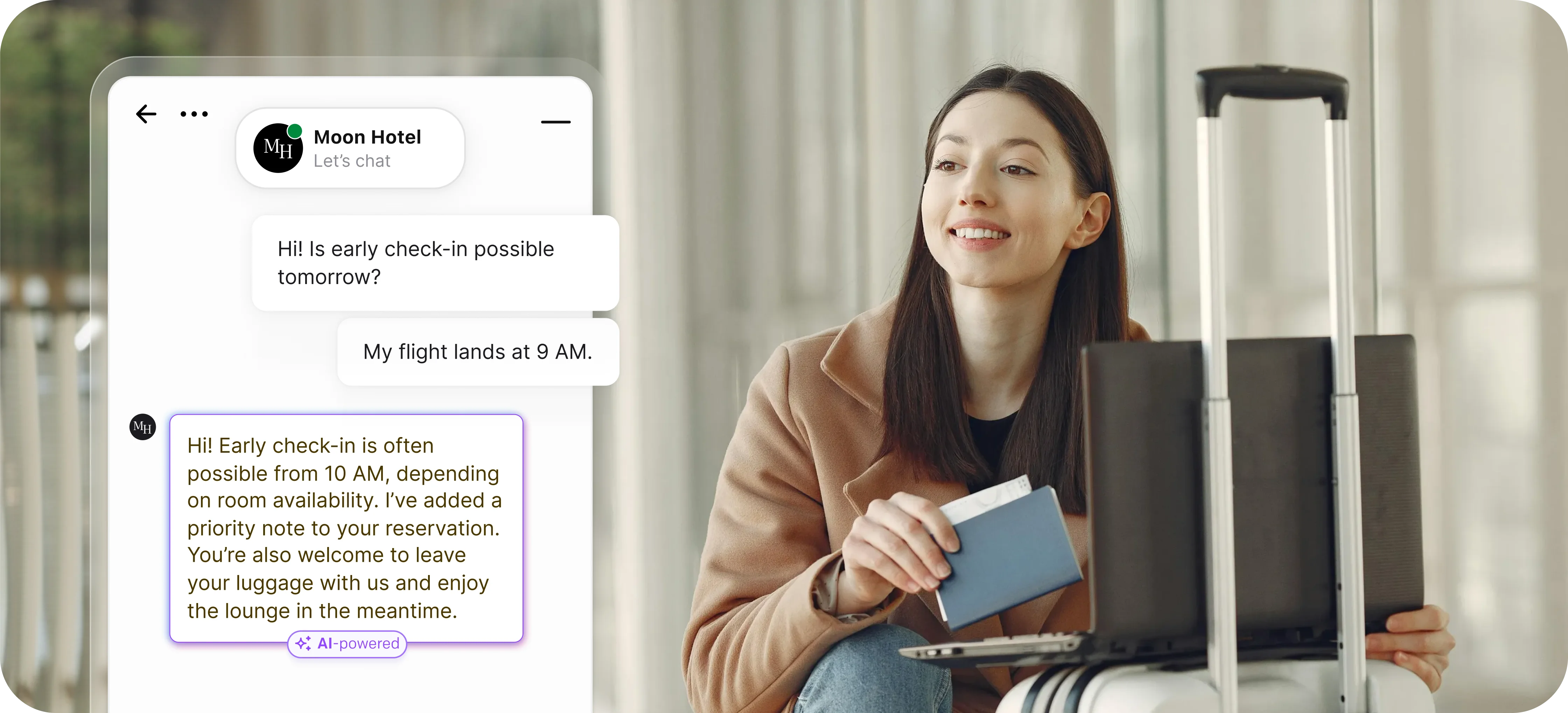 Enable conversations to begin anytime - respond at your convenience. Your hotel achieves 24/7 availability without expanding daily operations - ideal for guests with pressing questions about check in times or booking modifications.